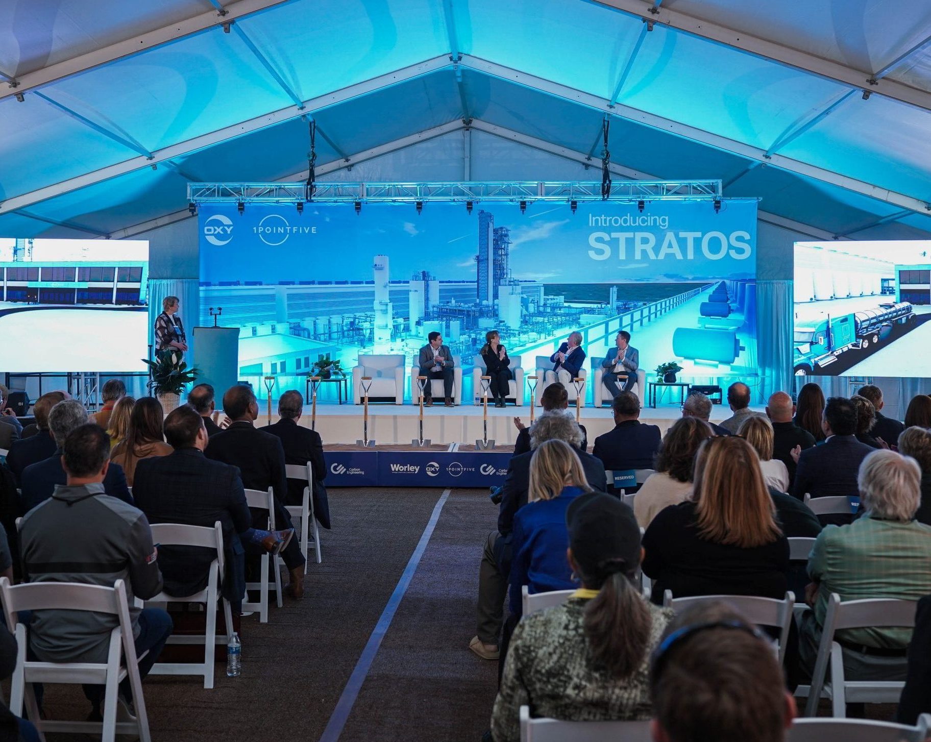Leadership from Occidental, 1PointFive, Carbon Engineering and Worley stepped up to the podium in turn to express what this day means for the future of their business and the climate. In a nod to the skies and the natural systems that this ambitious project seeks to protect and restore, Vicki Hollub shared that STRATOS earned its name to “convey the real sense of scale and possibility” of what Oxy is working to accomplish here.